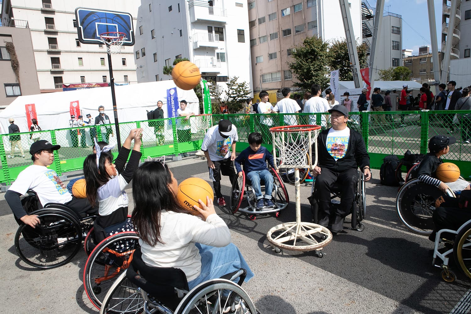 競技用の車いすを巧みに操作しながらプレーするバスケットボール。一緒にフリースロー対決をしてみよう。