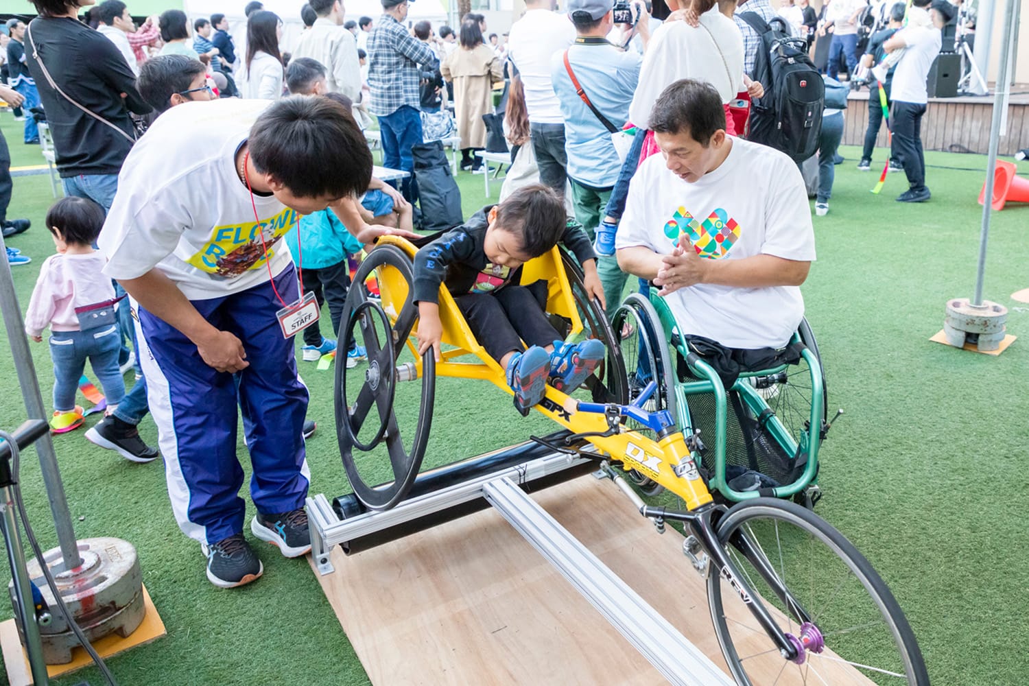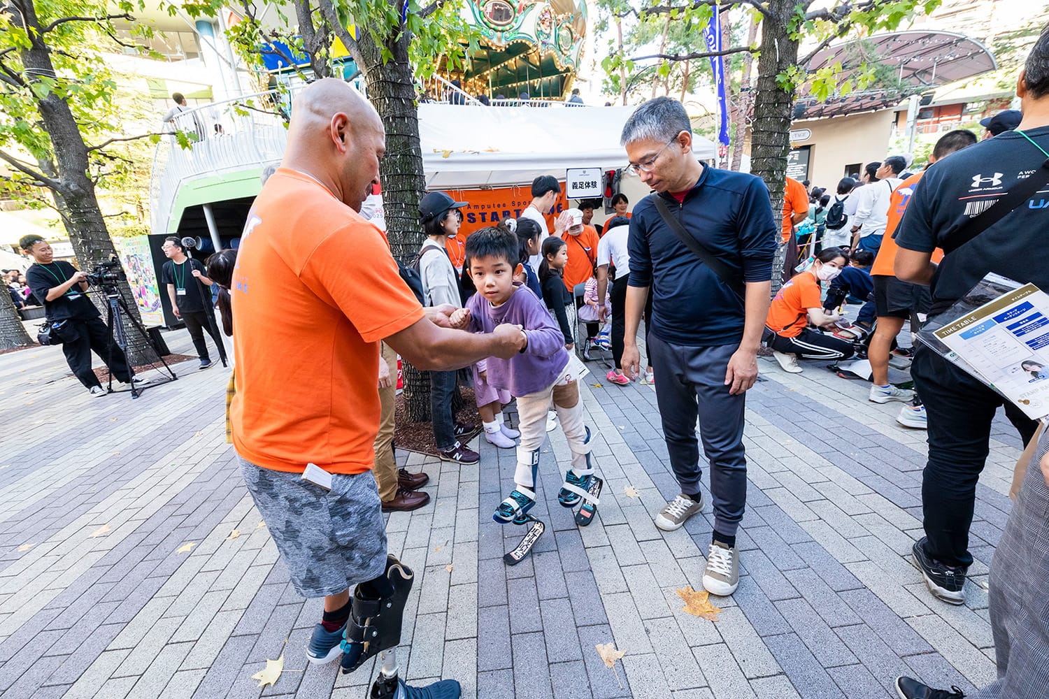 健常者の子どもから大人までが義足の体験ができるブースです。上手くバランスをとりながら歩いてみましょう。