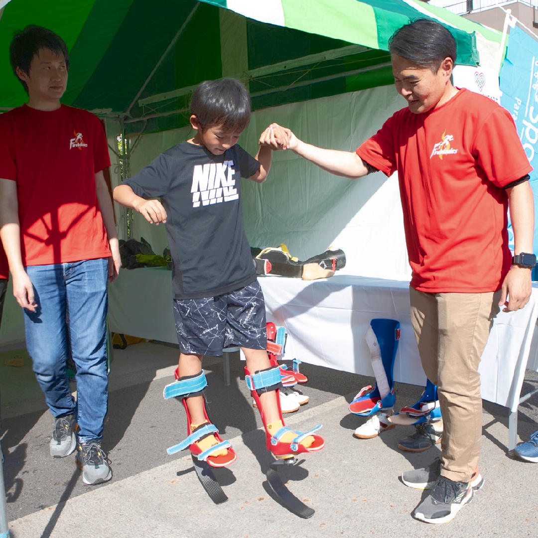 (講師:山本 篤)健常者の子どもから大人までが義足の体験ができるブースです。義足で歩いてみましょう。